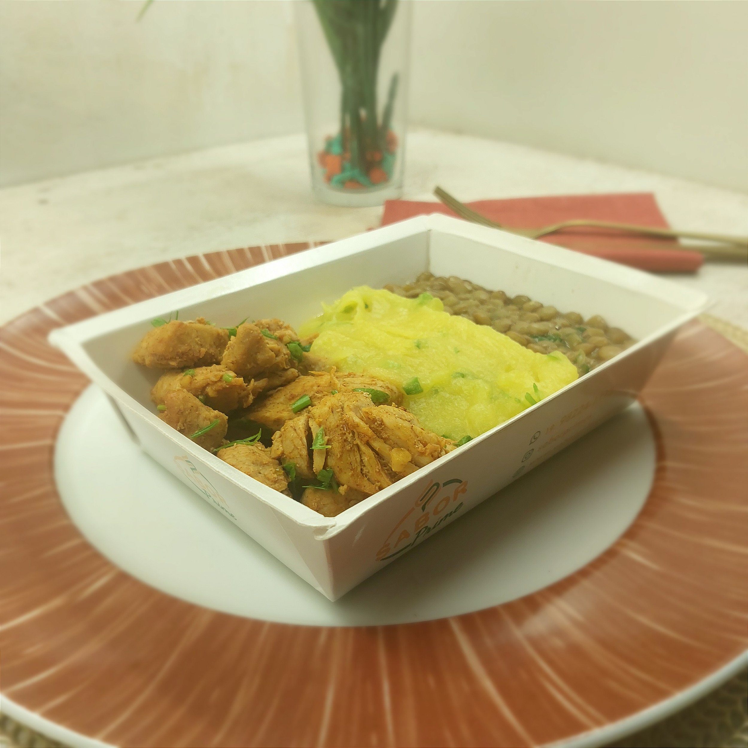 Filé mignon suíno c/ toque de laranja + Purê de mandioquinha + Lentilha