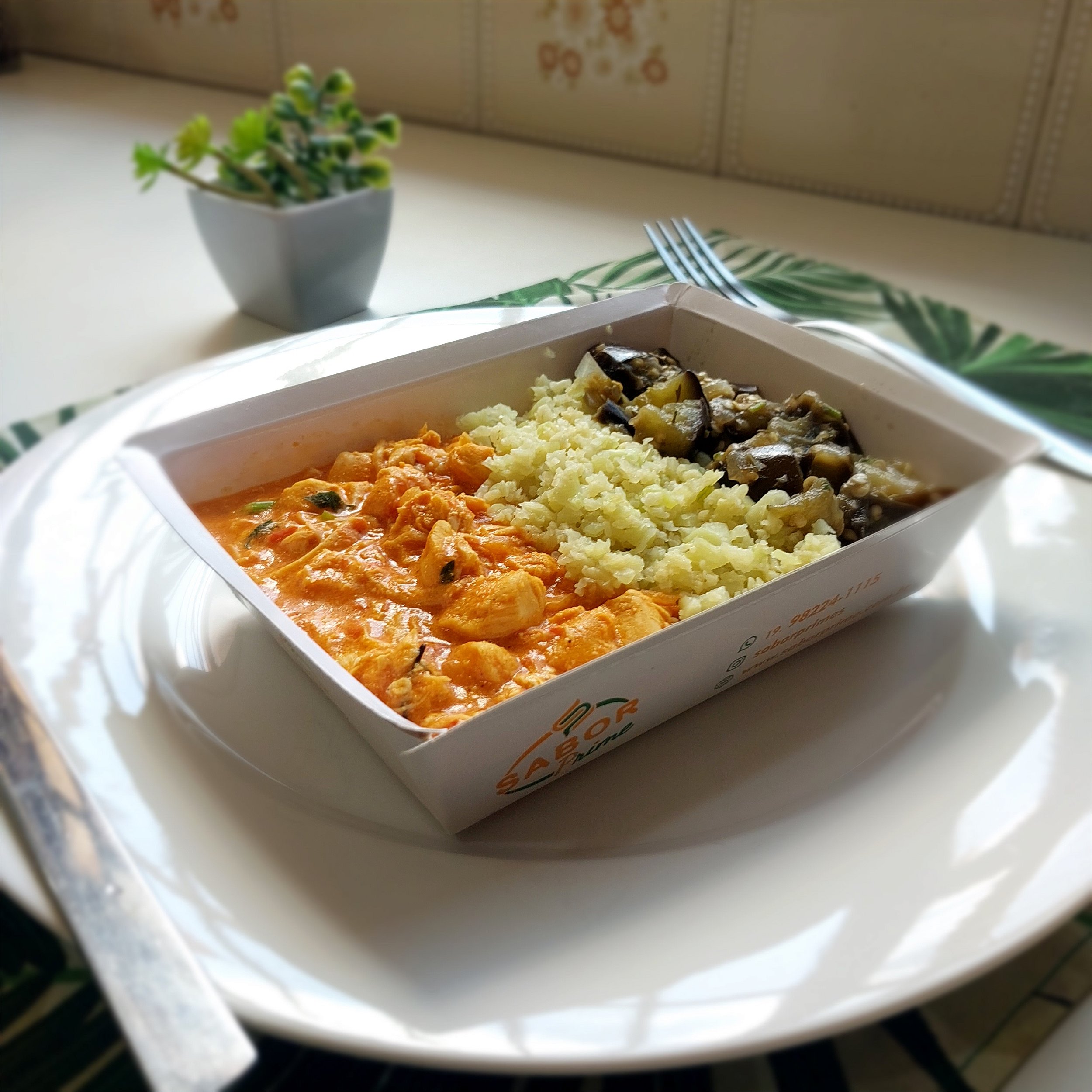 Strogonoff de frango + Arroz de couve flor + Berinjela